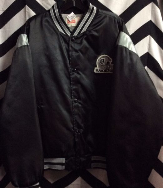 Raiders baseball style jacket, puffy, button-up, team patch on front, black/silver, size XL
