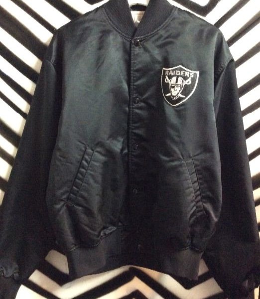 Raiders baseball style Starter jacket, snap-up, embroidered team logos, black/white, size L