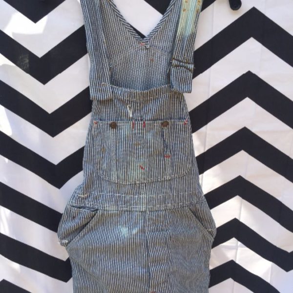 DICKIES OVERALLS, SEARSUCKER FABRIC W/RAILROAD PIN STRIPES, DISTRESSED