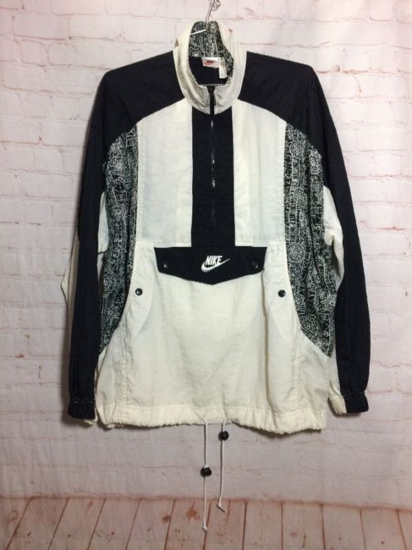 Rare 1990’s Nike windbreaker jacket, nylon, pullover, half zip-up, geometric print & solid panels in color-block design, white/black, size M