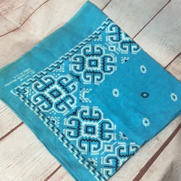 Rare bandana, square shape, made in USA, Aztec/Western patterned border design, baby blue/white/black