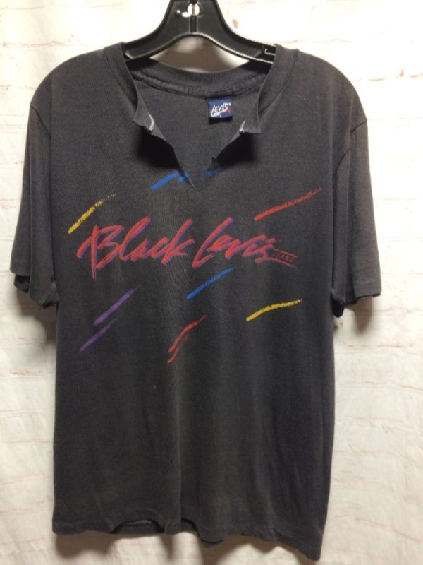Rare Levis T-shirt, cut v-neck, rad Black Levis Jeans screen print lettering with little multi-colored streaks/lines, distressed, black/red/purple/yellow/blue, size L