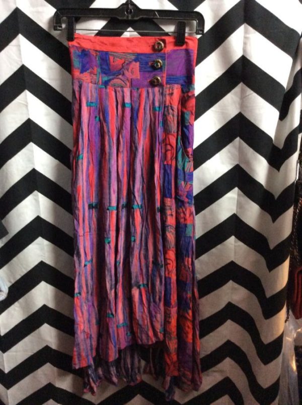 Skirt, rayon, flowing, button-up waist, pockets, watercolor striped shapes, pink/purple/teal/red, size S