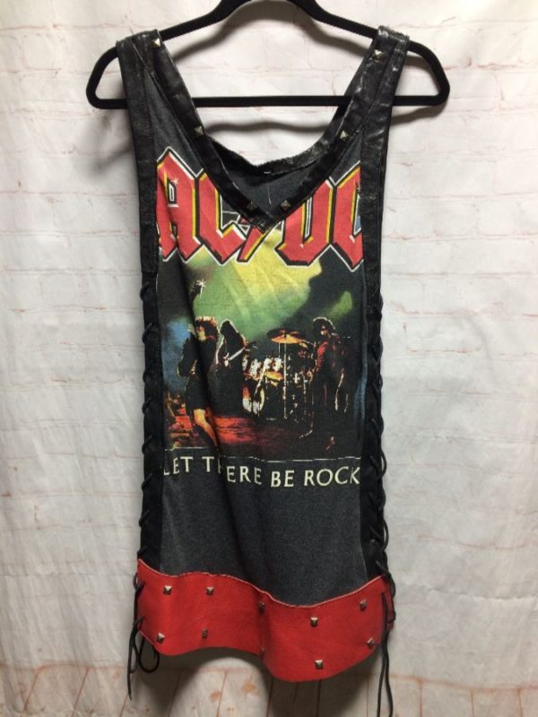 Dress, reconstructed ACDC cut-up T-shirt, sleeveless, v-neck, leather panels on hem/neck trim & down lace-up sides, embellished with studs, body con style, screen printed front graphic, black/gray/red/yellow/green/white