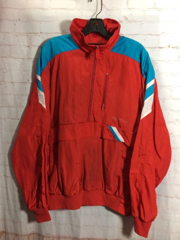 Sunbuster windbreaker jacket, cotton, pullover, 1/2 zip-up, ribbed cuffs, color-block design, pop colors, zippered pocket, red/white/blue, size M