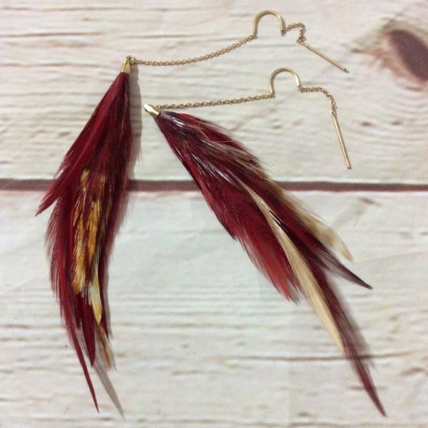 Earrings, Western look dangle style, feathers & chains, rust/gold