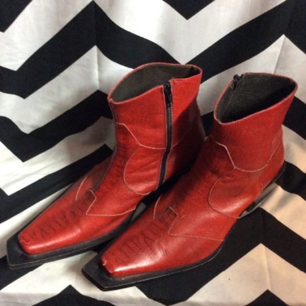 Crocodile boots, leather, patchwork panels, extended toe, zip-up sides, red, size 43