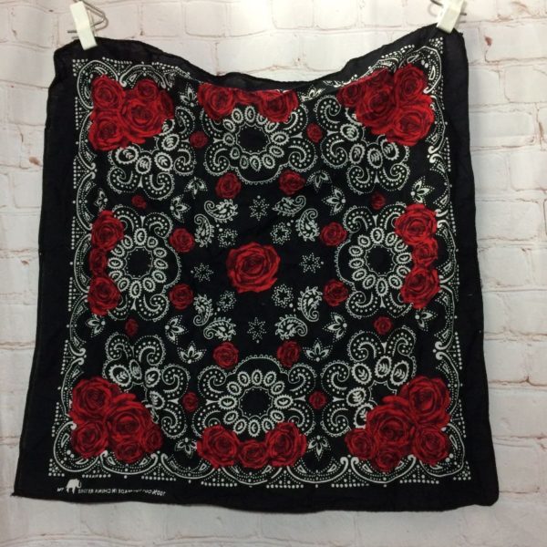 Bandana, cotton, square shape, red roses/Paisley print & swirly designs with ovals arranged in a circle, black/red/white