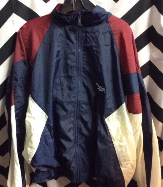 REEBOK WINDBREAKER JACKET, ZIP-UP, COLOR BLOCK DESIGN, NAVY/BURG/WHITE, SIZE XL AS IS