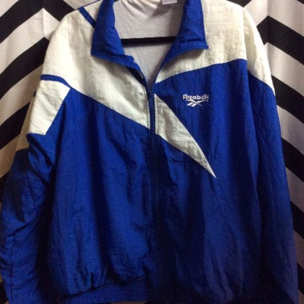 Reebok windbreaker jacket, zip-up, embroidered logo left chest, color block design, blue/white, size L