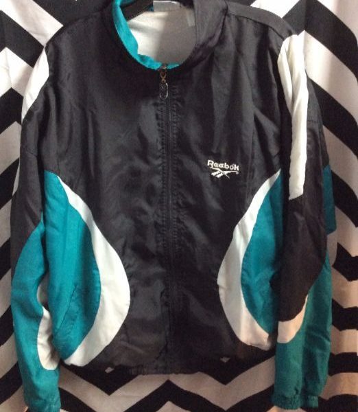 Reebok windbreaker jacket, zip-up, color block design, appliqued back design, teal/black/white, size L