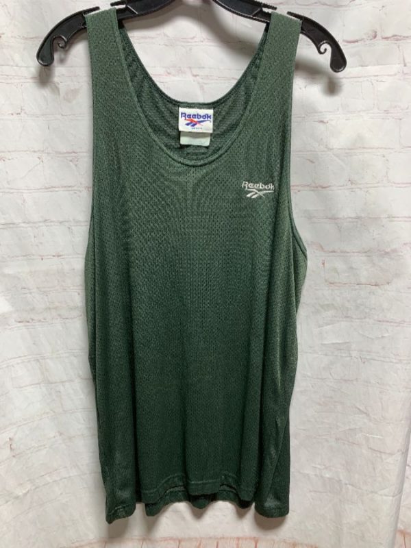 Reebok basketball jersey, tank top, athletic mesh fabric, left chest logo, olive green, size L