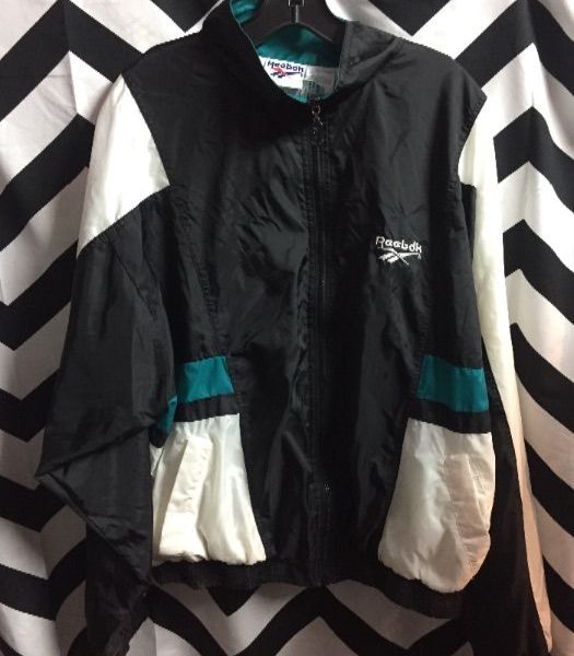 Reebok windbreaker jacket, zip-up, color block/window pane design, white/black/teal, size L