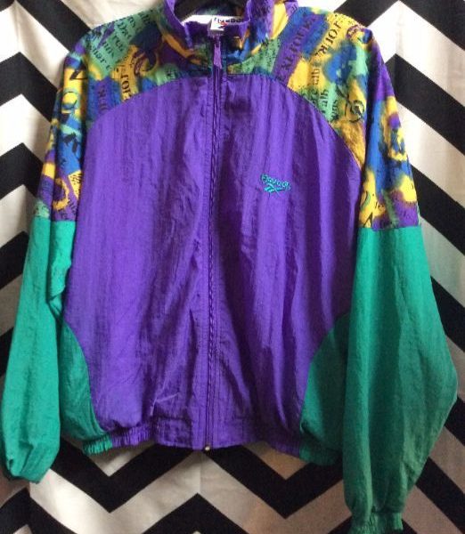 Reebok windbreaker jacket, zip-up, color block design, music note pattern & solid fabric, purple/green, size M