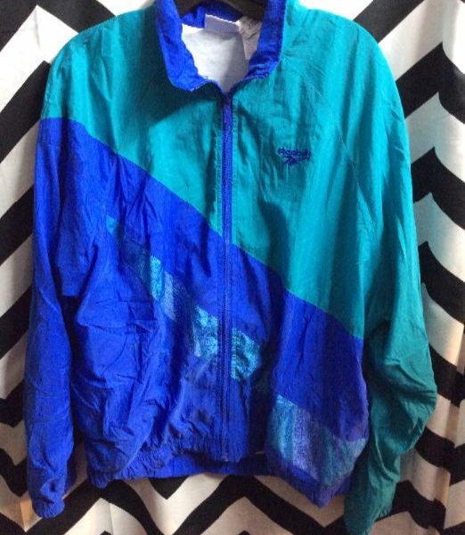 Reebok windbreaker jacket, zip-up, soft, funky design, blue/teal/purple, size L small fit