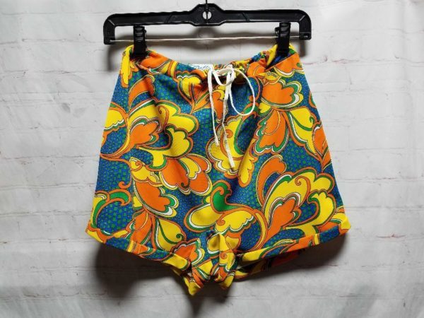RETRO 1960S-70S PSYCHEDELIC PRINT DOLPHIN SWIM SHORTS W/ DRAWSTRING WAIST