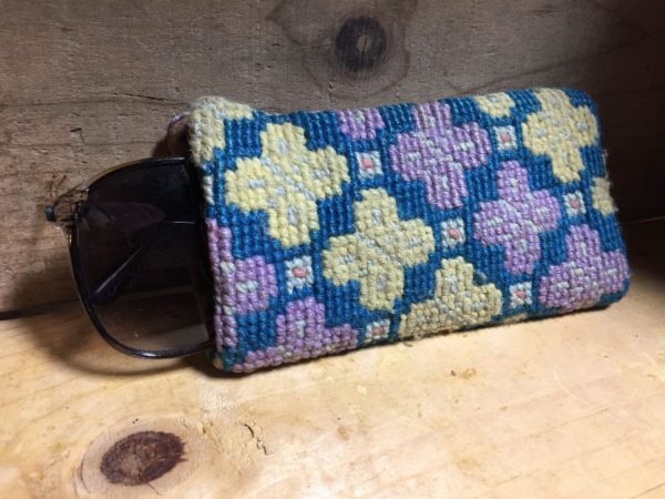 1960’s retro sunglasses case, needlepoint, floral pattern design, blue/purple/yellow/pink, size one size