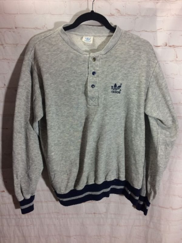 Retro 1970’s-80’s Adidas sweatshirt, Henley style, pullover, long sleeves, 3 button neck, striped trim on cuffs & hem, screen printed Trefoil left chest design, gray/black, size L As is