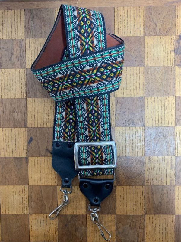 Retro 1970’s film camera strap, leather trim, classic style, woven diamond design, green/black/brown/tan, size wide