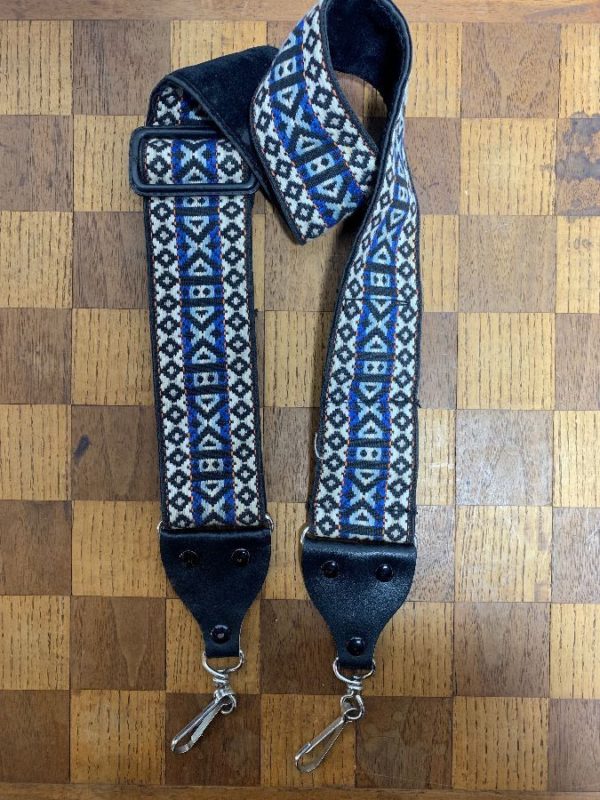 Retro 1970’s film camera strap, leather & velvet trim, classic style, woven x design, black/blue/creme