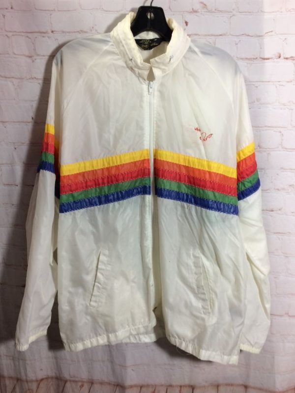 1970’s Retro Sherry windbreaker jacket, nylon, zip-up, hide-away hood, horizontal rainbow stripe design, white/yellow/orange/red/blue/green, size M As is