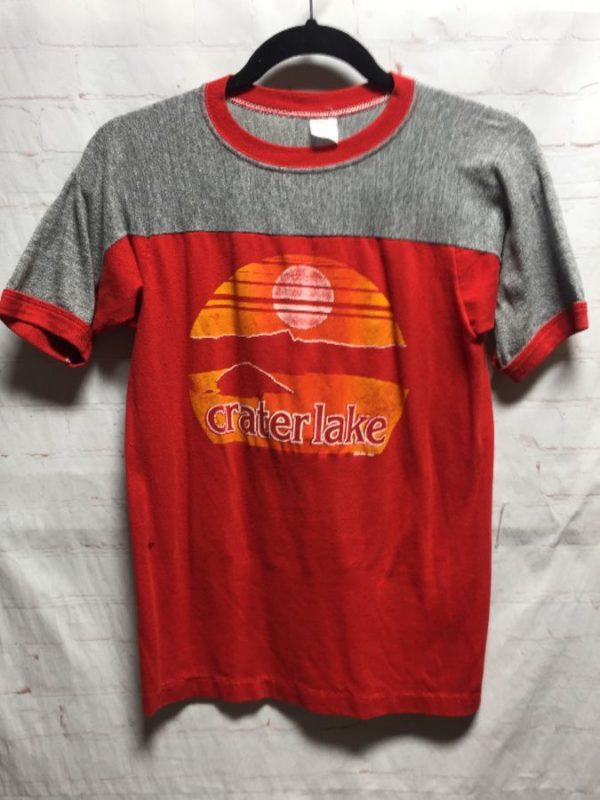 RETRO 1970’S RINGER TEE W/ CRATER LAKE & SUNSET GRAPHIC