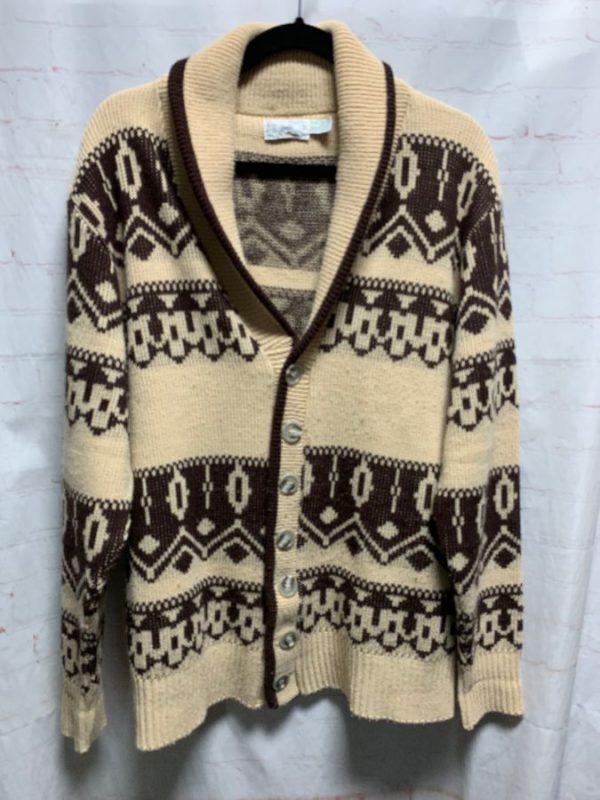 Retro 1970’s King Size cardigan sweater, virgin Orlon, knit, button-up, collar, The Dude geometric patterned horizontal striped pattern, beige/brown, size L