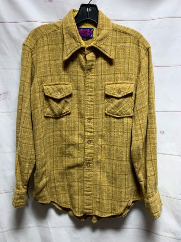 RETRO 1970’S PONDEROSA FLANNEL SHIRT, WOOL, LONG SLEEVES, BUTTON-UP, FUNKY ELBOW PATCH ON LEFT ELBOW, PLAID DESIGN, YELLOW/BROWN/WHITE, SIZE M