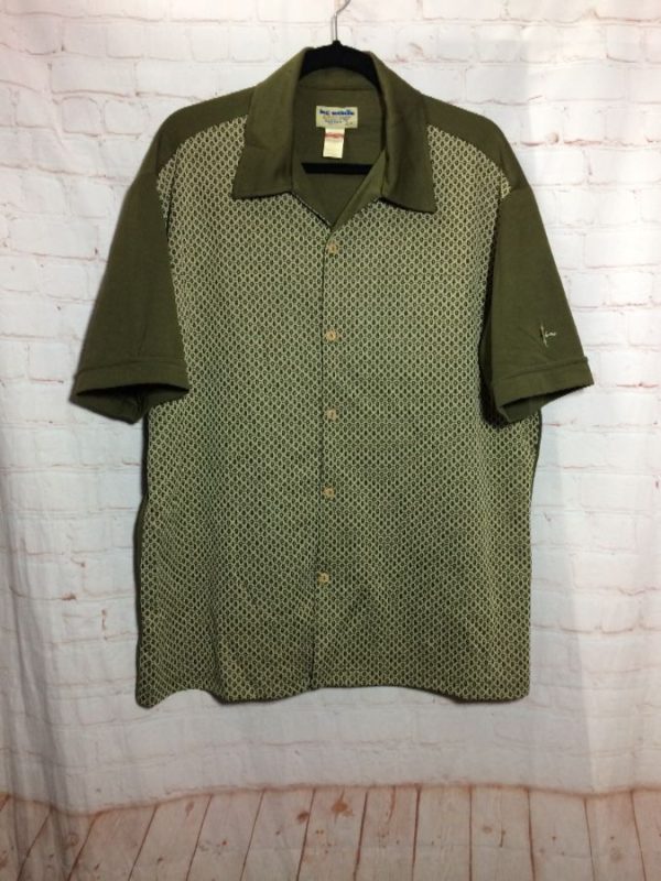 BC Ethic Lounge shirt, short sleeves, button-up, tiny offset print pattern on front section, contrasting color on sleeves/collar/back, logo on sleeve, green/white, size L