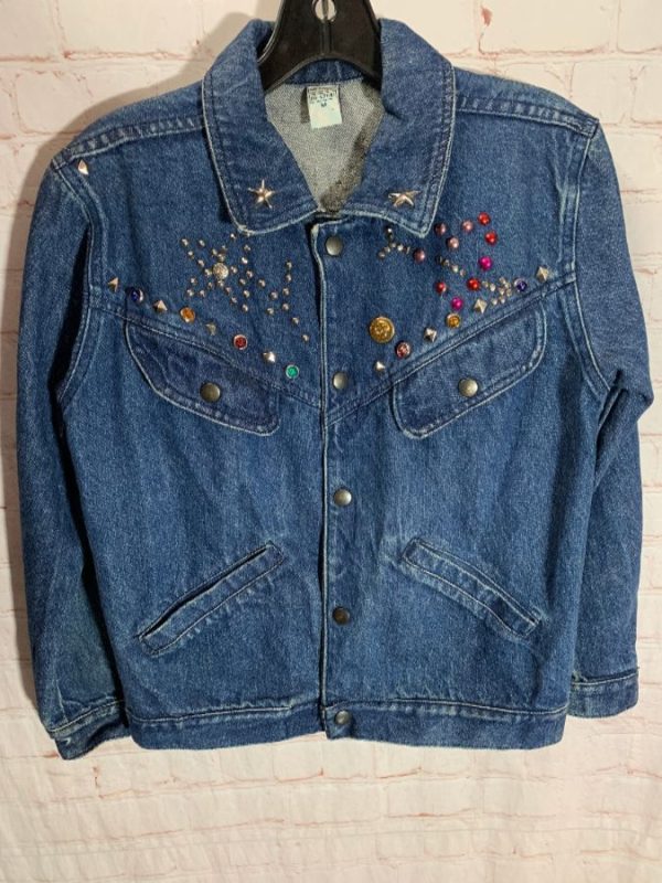 Retro 1990’s denim jacket, button-up, 4 front pockets 2 with snaps, stars on collar tabs, bedazzled & bejeweled designs & Suhey on back yoke, acid washed, medium blue/multi, size M