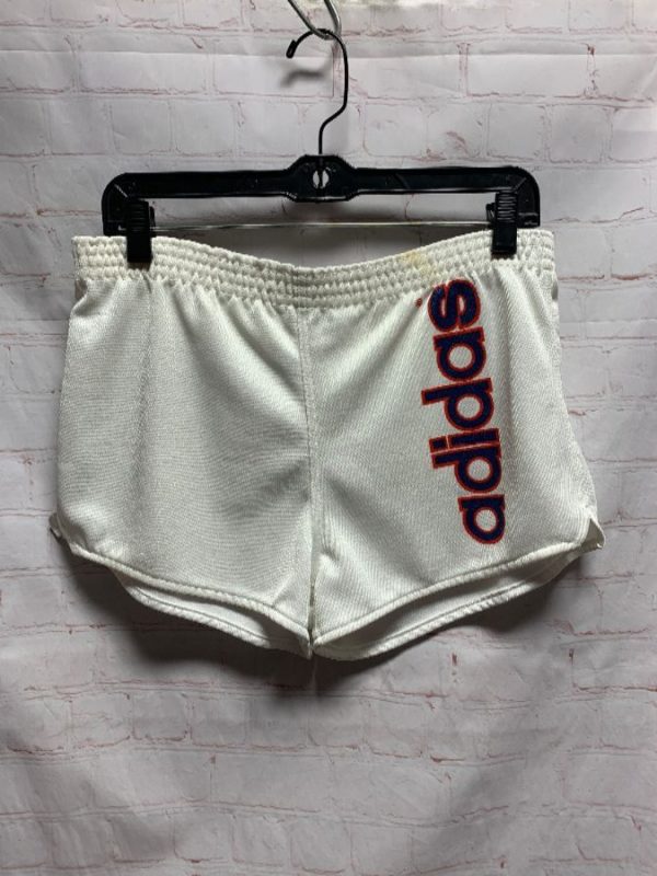 Retro Adidas shorts, athletic style, elastic waist, large screen printed vertical logo down left side, white/red/black, size M As is