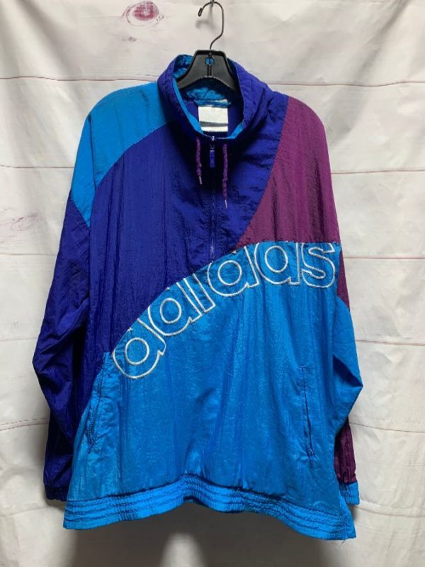 RETRO ADIDAS WINDBREAKER JACKET, 1/4 ZIP-UP, COLOR-BLOCK DESIGN, EMBROIDERED FRONT AND BACK DESIGNS, DARK BLUE/MEDIUM BLUE/PURPLE/WHITE, SIZE L AS IS