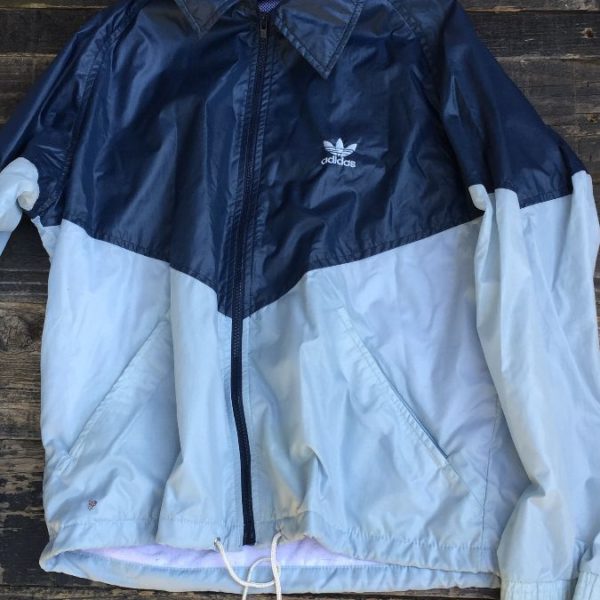 Retro Adidas windbreaker jacket, zip-up, hideaway hood, color-block design, left chest logo,