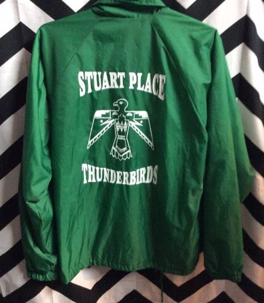 Retro Stuart Place Thunderbirds coaches jacket, button-up, screen printed, green/white, size S