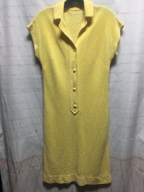Retro dress, knit, cap sleeves, 1/2 button-up, collar, midi length, pale yellow, size M