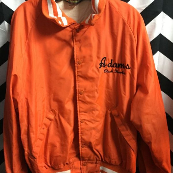 Retro coach jacket, snap-up, Adams Black Hawks, striped trim on collar/cuffs/hem, orange/white, size XL