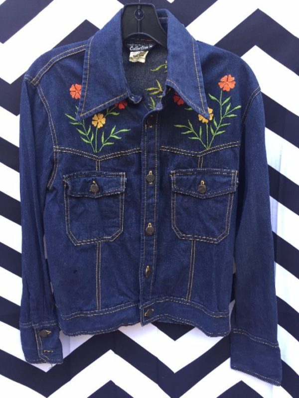 RETRO DENIM JACKET, BUTTON-UP, FRONT POCKETS, EMBROIDERED FLOWER DESIGNS FRONT & BACK, CONTRAST STITCHING