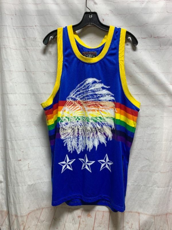 Retro Winchester basketball jersey, pullover, tank top, striped trim on neck & arms, horizontal stripes across chest, Denver Nuggets, #23, screen printed full front graphic with Native American skull in full head-dress/stars & full back number/stars, NBA, blue/yellow/red/orange/green, size XL
