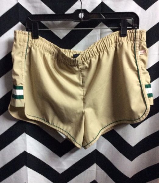 Retro Jantzen swim trunks/running shorts, dolphin, stripes on side panels, tan/black/white, size 36