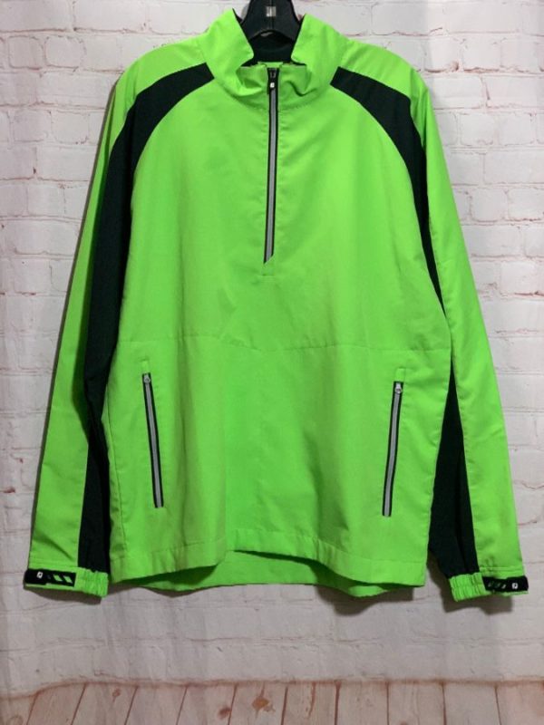 Retro Feel The Joy jacket, half zip-up, color-block pattern, neon-colors, back logo below neck, zip-up front pockets, neon green/black, size M