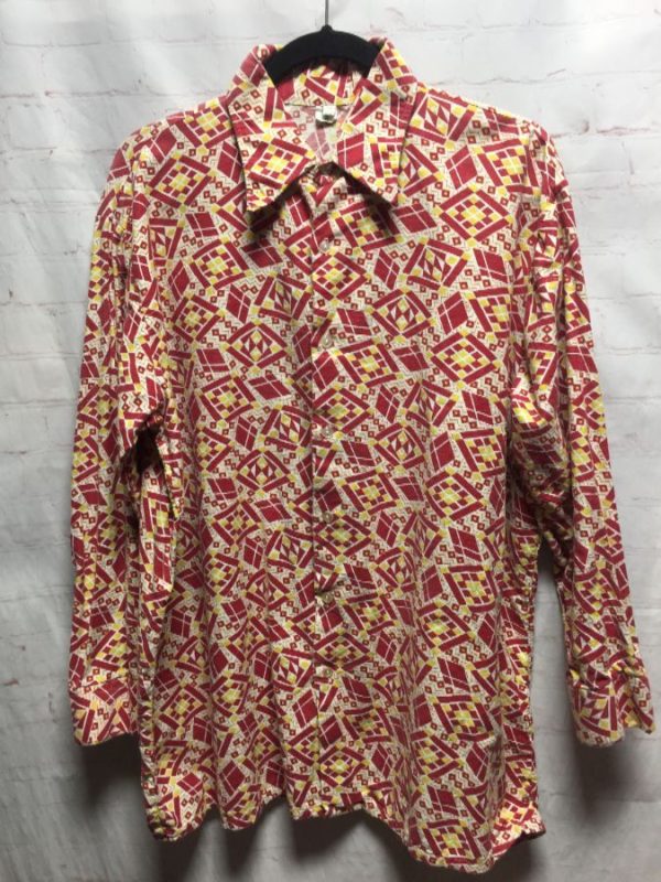Retro shirt, cotton, long sleeves, button-up, geometric triangle print, burgundy/yellow/white