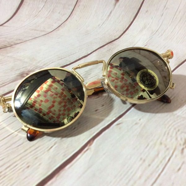 Retro sunglasses, round frame, spring arms, gold metal frames with tortoise shell ear pieces, cool colored lenses, dead-stock, gold/brown