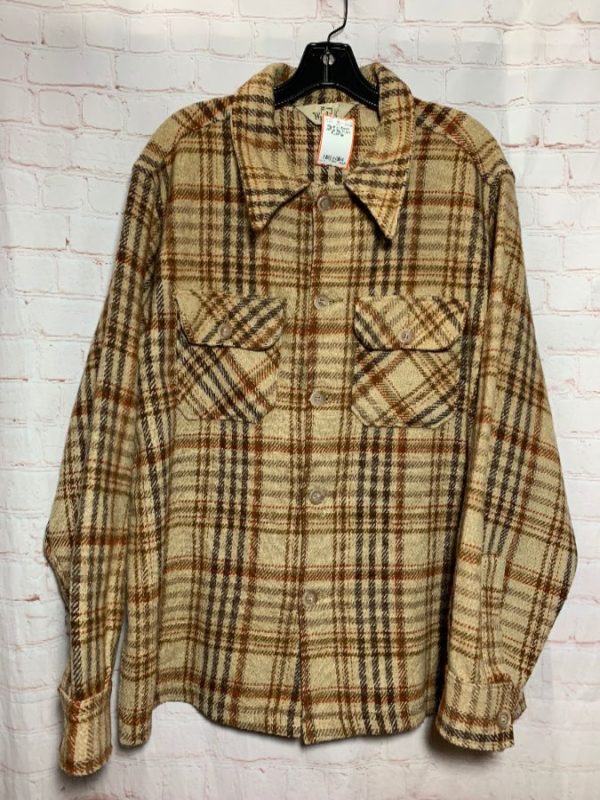 Retro Woolrich flannel shirt, heavy wool, long sleeves, button-up, plaid design, 2 front pockets, tan/brown/chocolate/rust