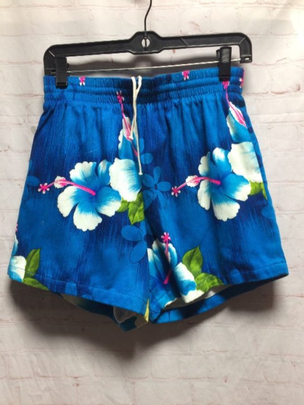 Retro Royal Hawaiian shorts, cotton, elastic waist with drawstring, made in Hawaii, Hibiscus floral print, blue/white/yellow/green/pink