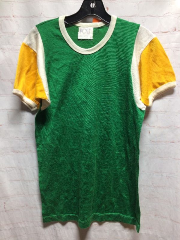Retro Post sports jersey, pullover, short sleeves, stripes on sleeves & ring around neck, color-block design, green/white/yellow, size S