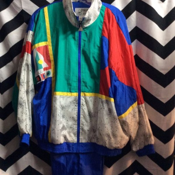 Retro jogging suit, zip-up, jacket & pants, color block design, green/red/blue/yellow/white-gray, size M