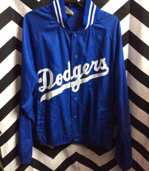 Retro baseball jacket, LA Dodgers, button-up, super thin, striped color, screen printed graphic full front, blue/white, size L