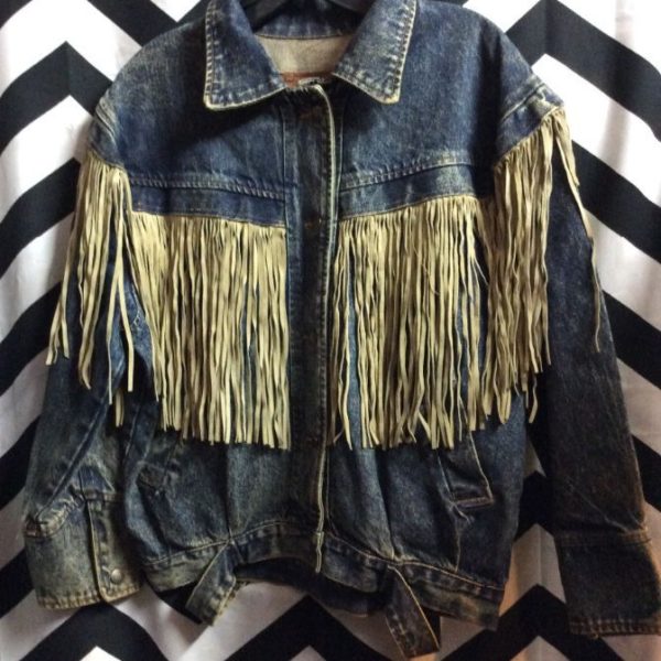 1980’s retro denim jacket, long leather fringe on sleeves/chest/back, blue/creme, size S
