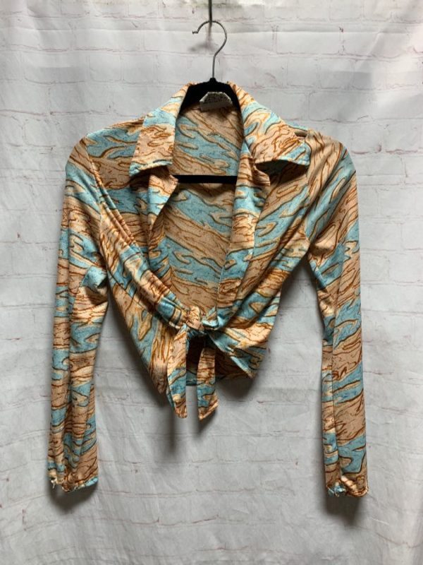 RETRO LS BD TIE FRONT POLY SWIRL PRINTED BLOUSE