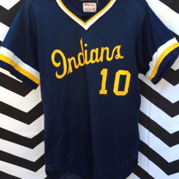 Retro Wilson sports jersey, mesh fabric, Indians #10, ringer style, screen printed lettering, navy-blue/yellow/white, size 42